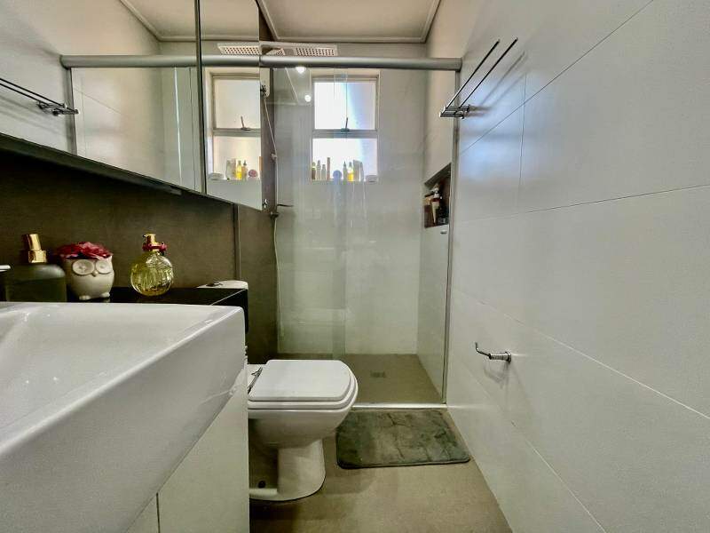 Banheiros (social e suíte) com acabamento refinado, bancadas em granito, armários sob medida e box em blindex.