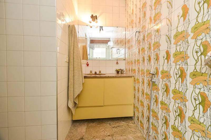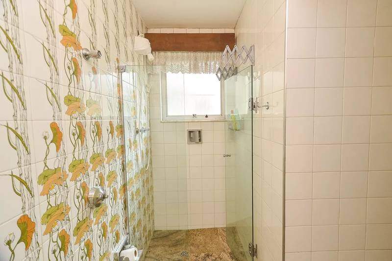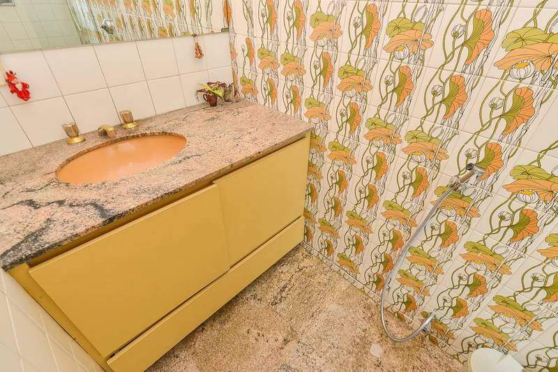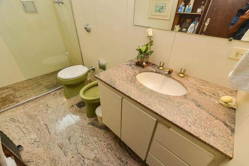 Banheiro social com espelho, bancada e piso em granito, armários, bidê e box em blindex