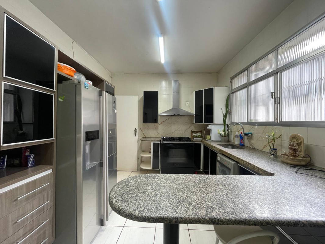 Cozinha com piso e revestimento em cerâmica, bancadas em granito, armários planejados e despensa.